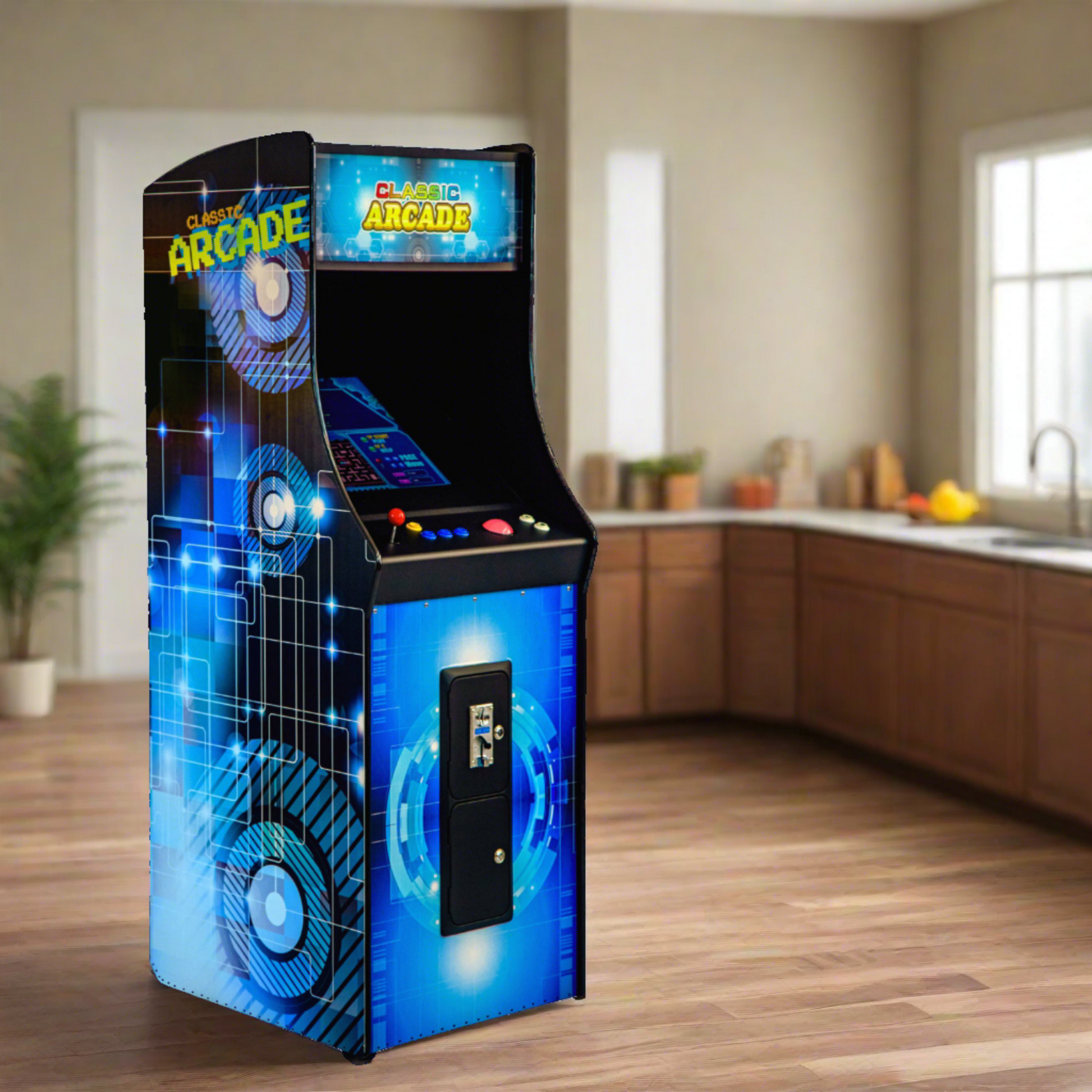 - Bring the noise! (Or don’t) Your arcade machine is custom built an amplified sound system including bass and treble controls. Crank up the bass or play on mute, it’s up to you!